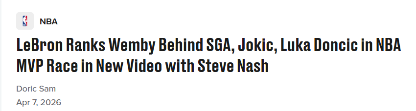 不过,詹姆斯随后表示,在今年的MVP角逐中,他会把雷霆球星亚历山大、掘金球星约基奇以及湖人队友东契奇排在文班亚马之前。